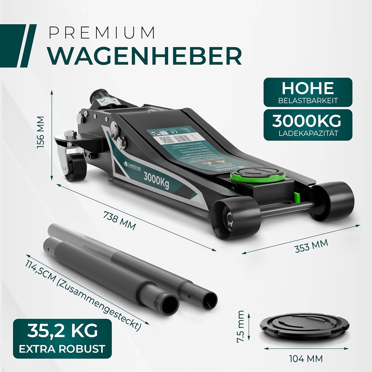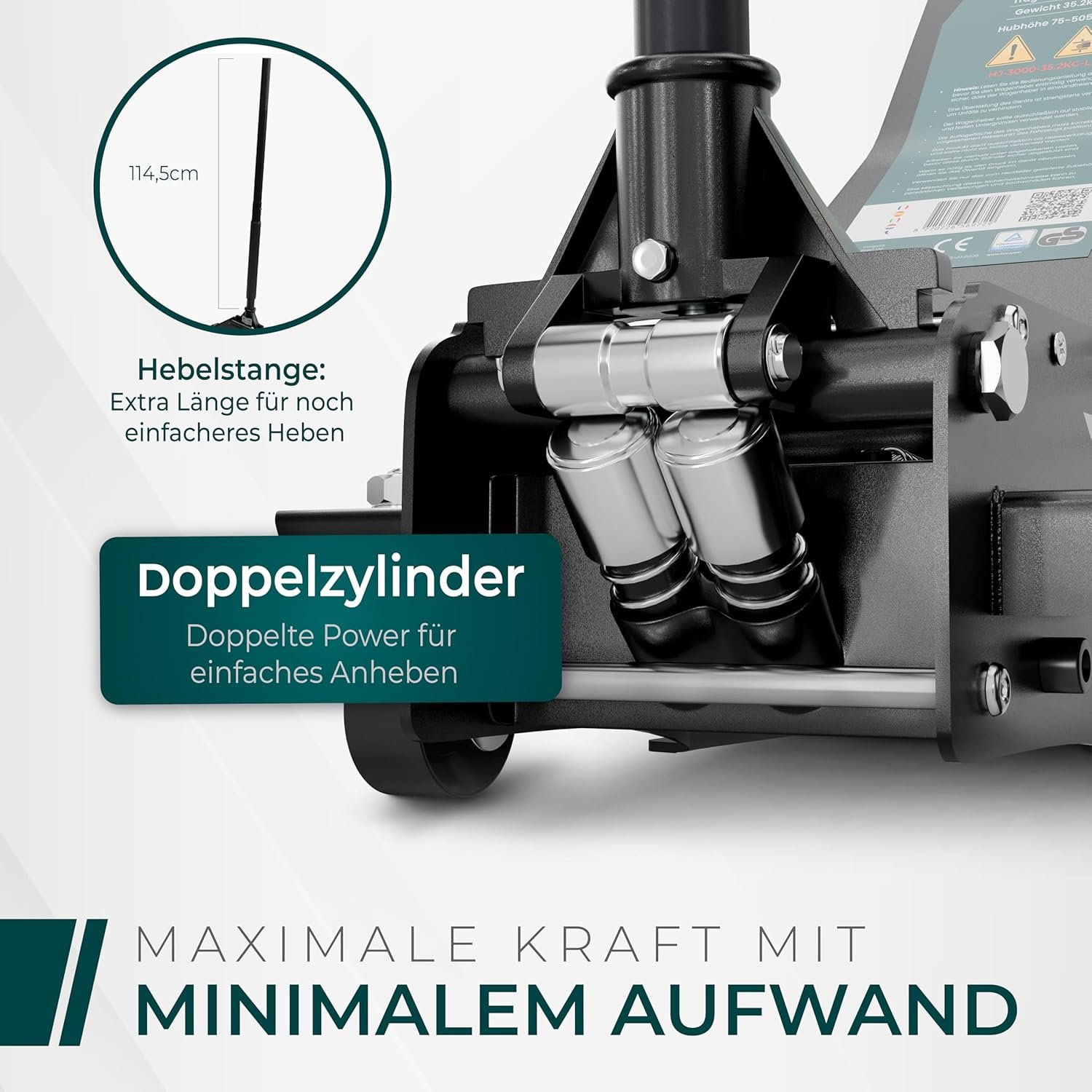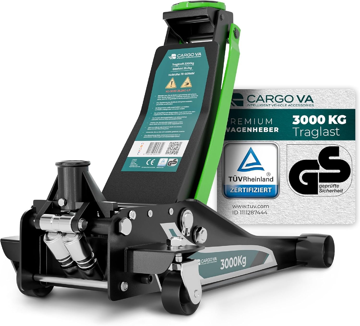 CargoVA Wagenheber Hydraulisch 3T – TÜV Zertifiziert 75-505 mm Hubhöhe, Wagenheber SUV inkl Gummiauflage, Profi Rangierwagenheber Hydraulischer perfekt für die Heimwerkstatt